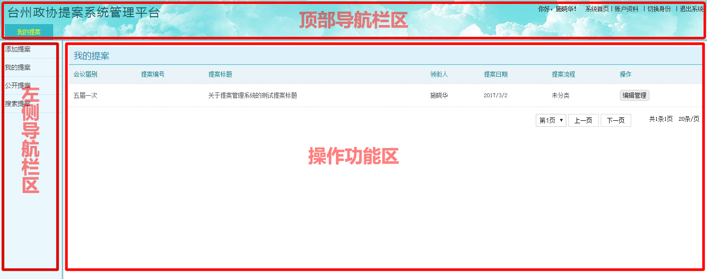 | 台州市政协提案管理系统界面基本区块图示
