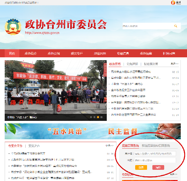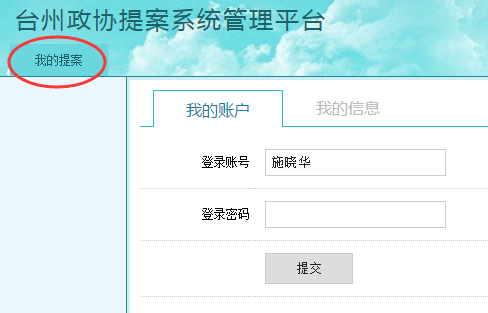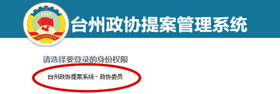 一、登录提案管理系统 打开台州政协网(网址:www.dchymf.com),在首页中部的【提案管理系统】登录区块,输入用户名和密码,点击【登录】按钮进入提案管理系统。(如下图) 二、选择登录身份 准确输入用户名和密码并点击登录后,将成功登录到提案管理系统的身份权限界面,选择并点击【台州政协提案系统—政协委员】进入操作界面。(如下图)