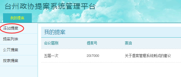 五、提交提案 1、点击系统界面顶部导航区的【我的提案】功能模块按钮,进入【我的提案】功能模块。(如下图)
